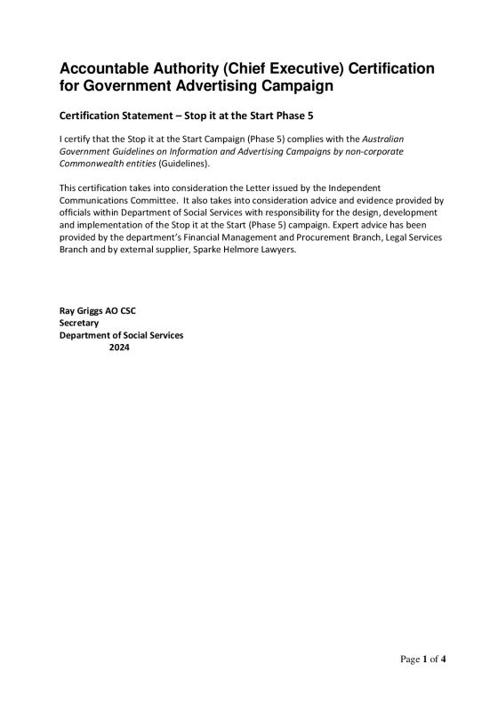 This certification takes into consideration the Letter issued by the Independent Communications Committee. It also takes into consideration advice and evidence provided by officials within Department of Social Services with responsibility for the design, development and implementation of the Stop it at the Start (Phase 5) campaign. Expert advice has been provided by the department’s Financial Management and Procurement Branch, Legal Services Branch and by external supplier, Sparke Helmore Lawyers.