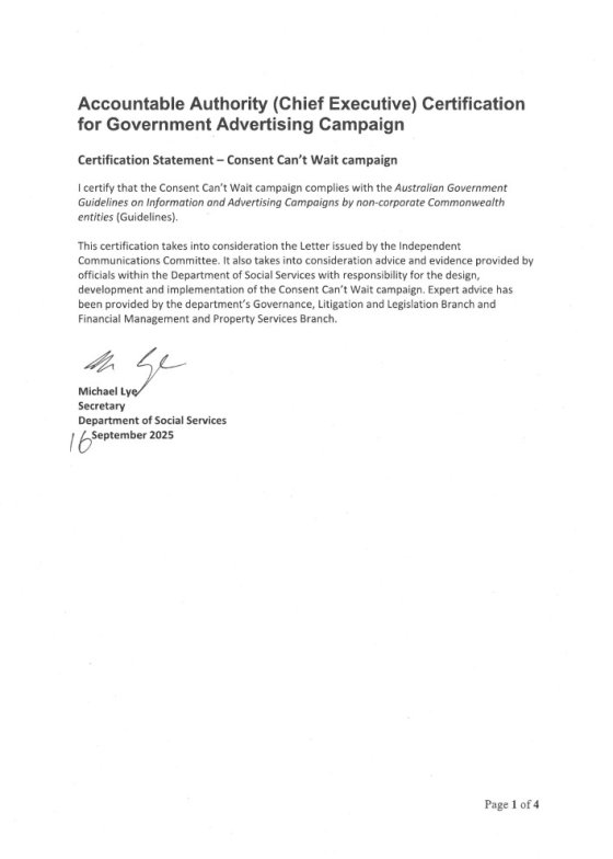I certify that the Consent Can’t Wait campaign complies with the Australian Government Guidelines on Information and Advertising Campaigns by non-corporate Commonwealth entities (Guidelines).