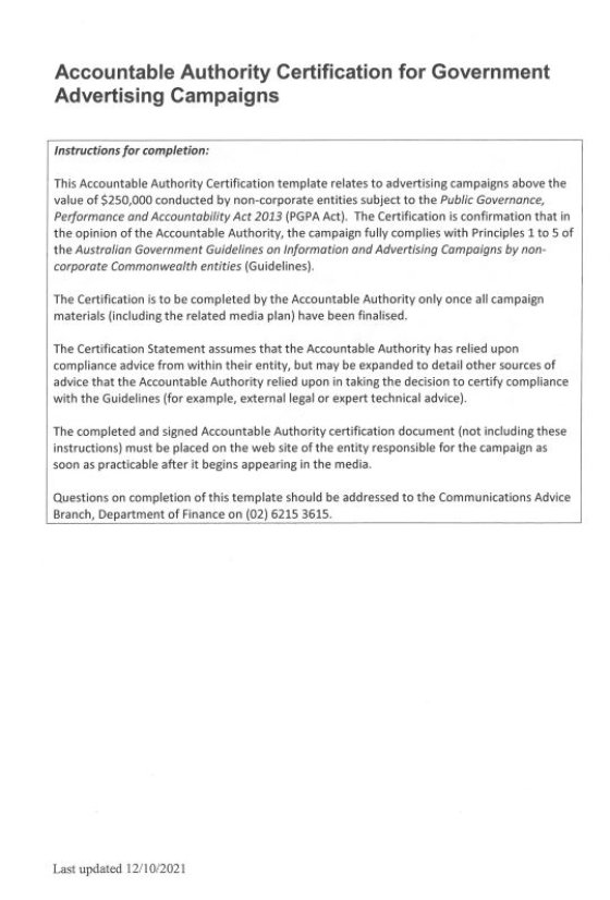 This certification takes into consideration the Report of the Independent Communications Committee. It also takes into consideration advice and evidence provided by officials within Department of Social Services (the department) with responsibility for the design, development and implementation of the Stop it at the Start campaign and advice provided by the department’s Legal Services Branch and Financial Management and Procurement Branch.