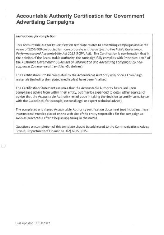 This certification takes into consideration the Report of the Independent Communications Committee. It also takes into consideration advice and evidence provided by officials within Department of Social Services (the department) with responsibility for the design, development and implementation of the Stop it at the Start campaign and advice provided by the department’s Legal Services Branch and Financial Management and Procurement Branch.