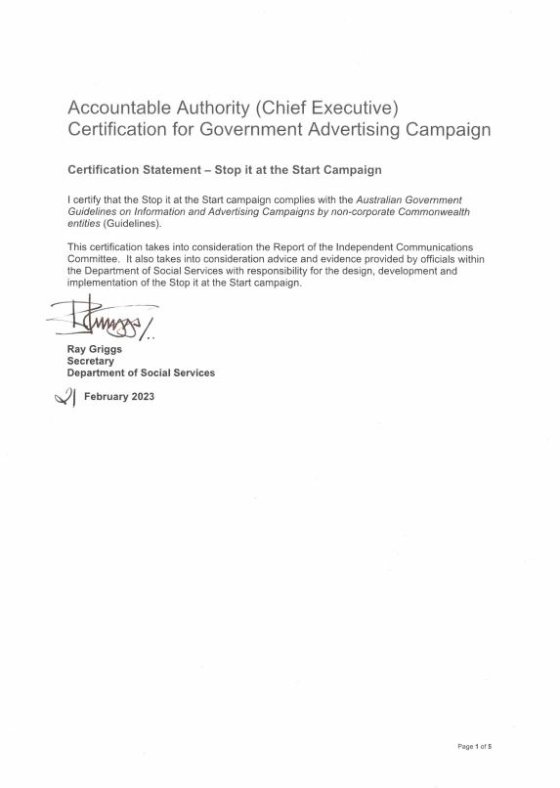 I certify that the Stop it at the Start campaign complies with the Australian Government Guidelines on Information and Advertising Campaigns by non-corporate Commonwealth entities (Guidelines).