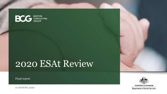 This report reviews the Employment Assessment Tool (ESAt) policy and processes for referring people to jobactive and Disability Employment Services. A person with disability, illness or injury may be referred for an ESAt to identify their work capacity and barriers to work and the most appropriate employment service program. The review was undertaken by Boston Consulting Group (BCG) on behalf of the Department of Social Services.