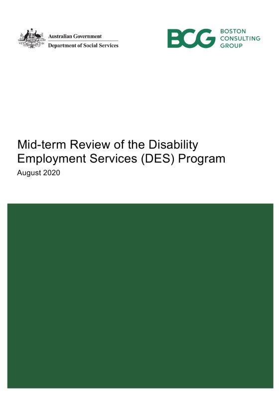 Boston Consulting Group (BCG) on behalf of the Department of Social Services completed a mid-term review of the Disability Employment Services (DES_ program, between May and August 2020.