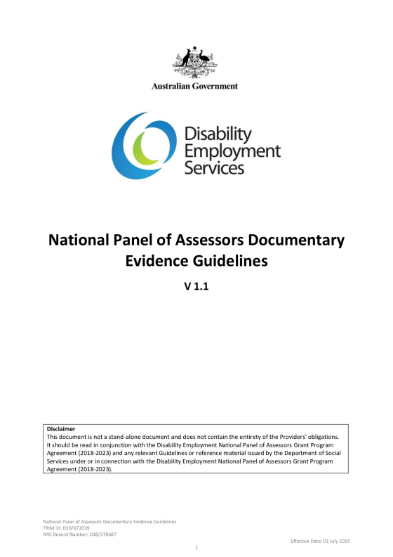 These Guidelines specify which Records of the National Panel of Assessors (NPA) Program provider (the Provider’) are satisfactory to the Department of Social Services (the Department) as sufficient evidence that Services were provided by the Provider for each claim for payment made under the Disability Employment National Panel of Assessors Grant Program Agreement 2018-2023 (the Grant Agreement), or which otherwise support a claim for payment made by the Provider under the Grant Agreement.