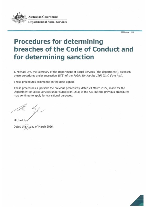 Michael Lye, the Secretary of the Department of Social Services, has established a set of Procedures for determining breaches of the Code of Conduct and for determining sanctions (‘Secretary’s Procedures’) under subsection 15 (3) of the Public Service Act 1999 ('the Act').