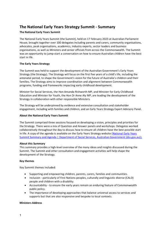The Government hosted a National Early Years Summit (the Summit) at Australian Parliament House on 17 February 2023. The Summit brought together parents, community organisations and representatives from across government, non-government, academic and business sectors to discuss the development of the Commonwealth Early Years Strategy.