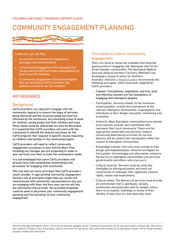 - A Community Engagement Plan template that can be used by CaFIS providers and guidance on how to usethe template
