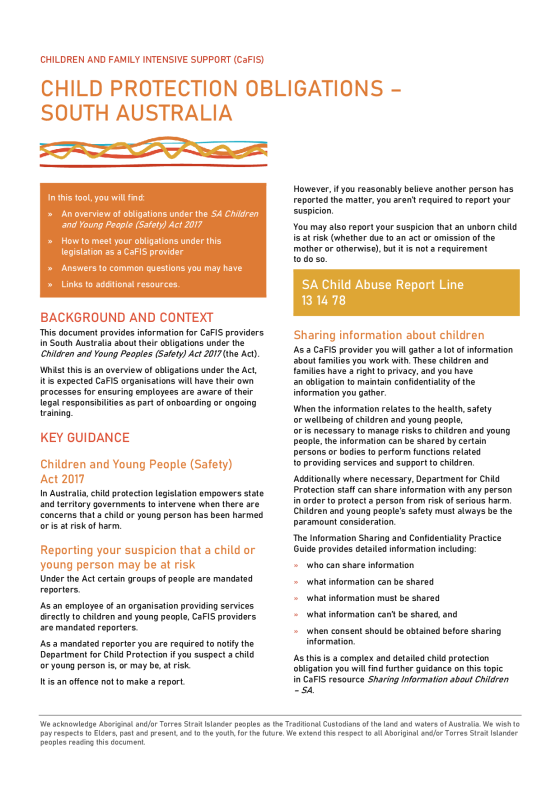 - An overview of obligations under the SA Children and Young People (Safety) Act 2017