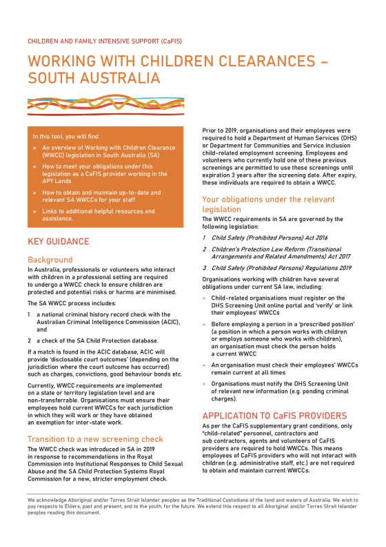 - An overview of Working with Children Clearance (WWCC) legislation in South Australia (SA)