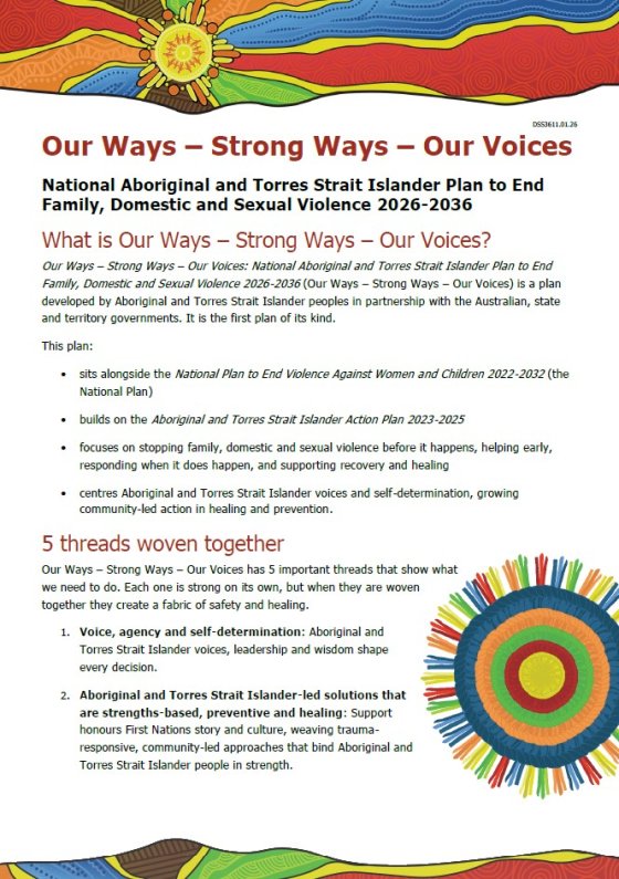 This factsheet summarises Our Ways – Strong Ways – Our Voices: National Aboriginal and Torres Strait Islander Plan to End Family, Domestic and Sexual Violence 2026–2036. It outlines why we need a plan to address family, domestic and sexual violence against First Nations women and children and how the plan helps community.