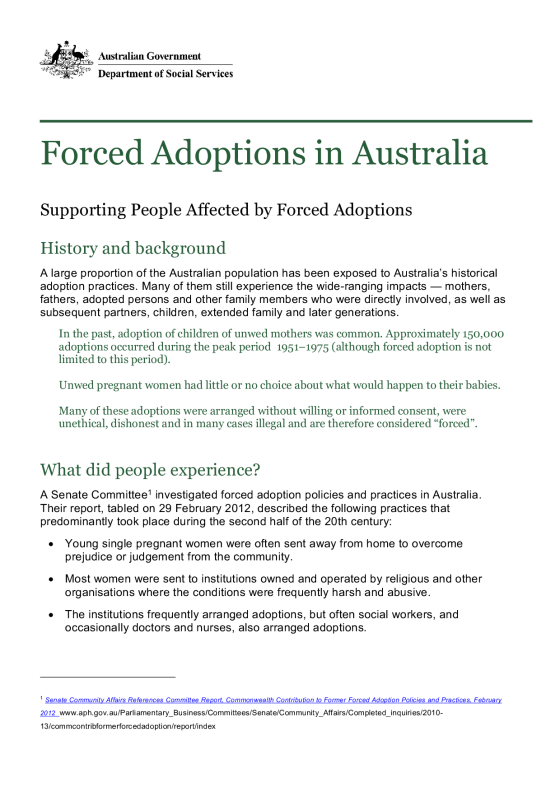 The Australian Psychological Society (APS) was funded by the Australian Government Department of Health to develop guidelines and training materials for mental health professionals to assist in the diagnosis, treatment and care of those affected by forced adoption practices. For more information go to the APS website(Opens in a new tab/window).