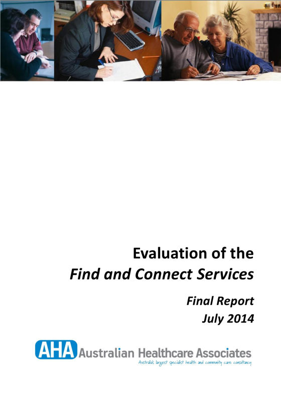 The Australian Healthcare Associates (AHA) was contracted to undertake an evaluation of the Find and Connect Support Services for Forgotten Australians and Former Child Migrants. The evaluation considered Find and Connect Support Services’ effectiveness for improving outcomes for Forgotten Australians and Former Child Migrants.