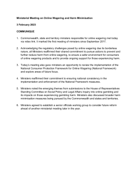 On 3 February 2023, Commonwealth, state and territory ministers responsible for online wagering met to reflect on challenges and successes in implementing the National Consumer Protection Framework and to support continued joint efforts to reduce harms from online wagering.
