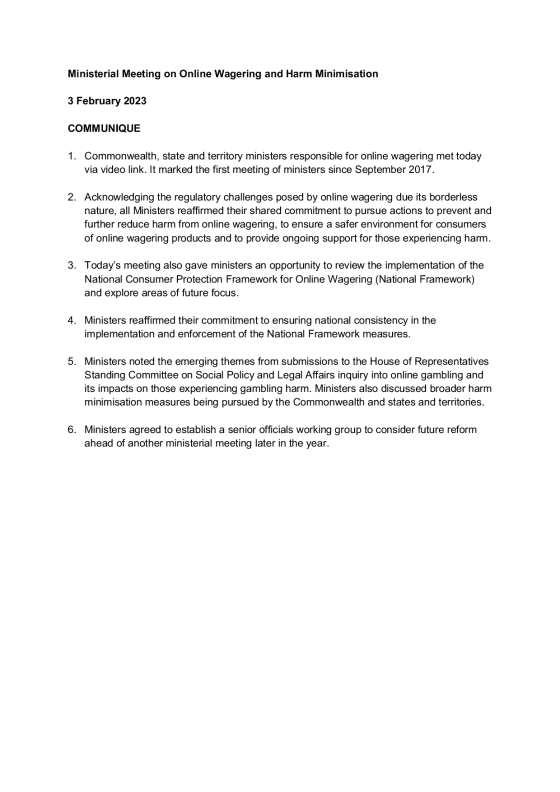 - Acknowledging the regulatory challenges posed by online wagering due its borderless nature, all Ministers reaffirmed their shared commitment to pursue actions to prevent and further reduce harm from online wagering, to ensure a safer environment for consumers of online wagering products and to provide ongoing support for those experiencing harm.