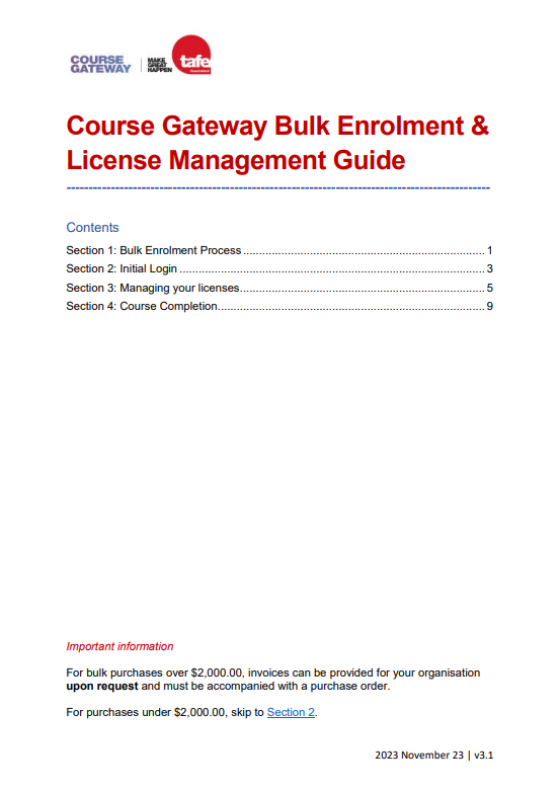 A guide to bulk enrolments and licence management, via the Course Gateway, for the National Consumer Protection Framework for online wagering - staff training measure.