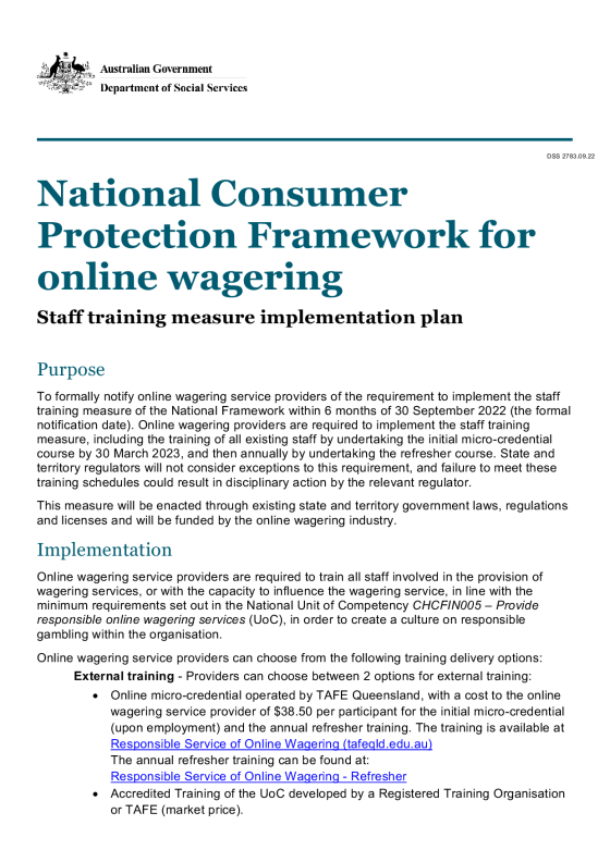 Online wagering providers are required to implement the staff training measure, including the training of all existing staff by undertaking the initial micro-credential course by 30 March 2023, and then annually by undertaking the refresher course.