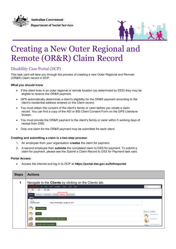 This task card will take you through the process of creating a new Outer Regional and Remote (OR&R) Claim record in the DCP.