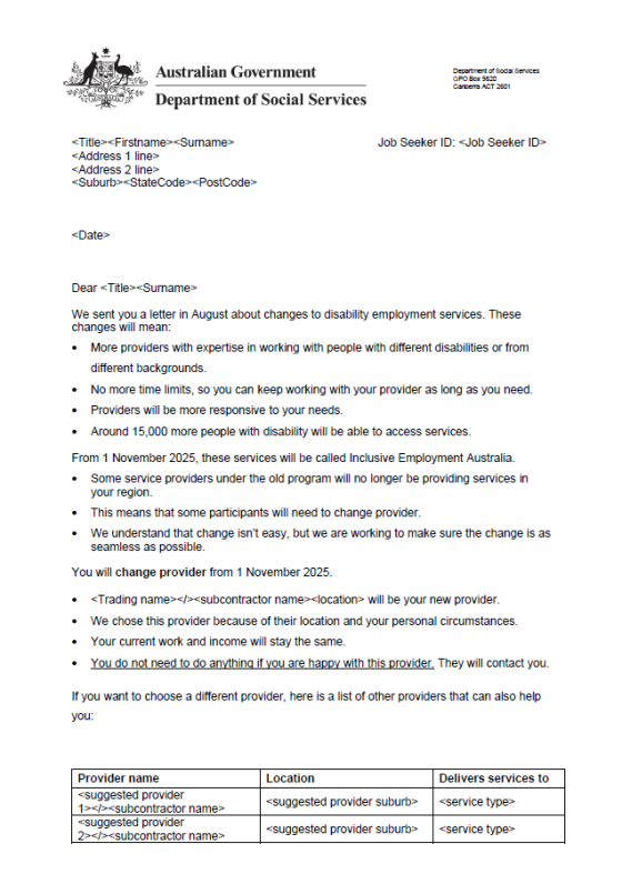 Inclusive Employment Australia: letter to participants – changing provider, October 2025