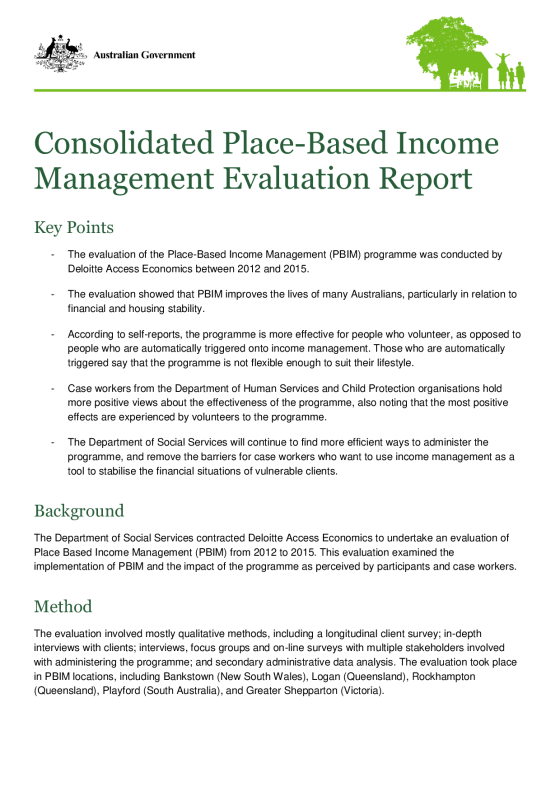 The Department of Social Services contracted Deloitte Access Economics to undertake an evaluation of Place Based Income Management (PBIM) from 2012 to 2015. This evaluation examined the implementation of PBIM and the impact of the program as perceived by participants and case workers.