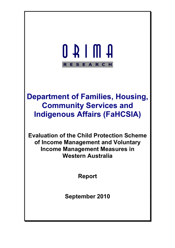 The former Australian Government Department of Families, Housing, Community Services and Indigenous Affairs, supported by the Western Australian Department for Child Protection, commissioned ORIMA Research to conduct an evaluation of the income management trial in Western Australia (WA).