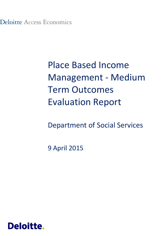 This document is the third Deloitte Access Economics evaluation report to be delivered to the Department of Social Services (DSS) as part of the evaluation of Place Based Income Management (PBIM). It includes findings pertaining to medium-term outcomes of PBIM for customers and stakeholders who have been involved with the measure.