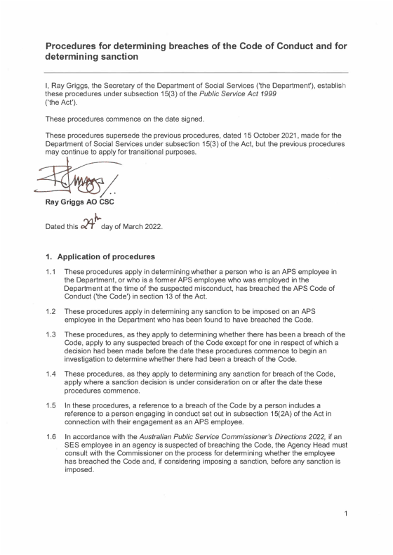 Ray Griggs, the Secretary of the Department of Social Services, has established a set of Procedures for determining breaches of the Code of Conduct and for determining sanctions (‘Secretary’s Procedures’) under subsection 15 (3) of the Public Service Act 1999 ('the Act').