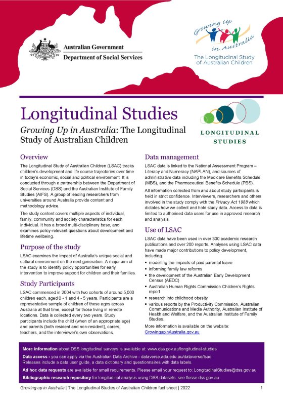 The study covers many aspects of individual, family, community and society characteristics. LSAC has a broad multi-disciplinary base. It examines policy-relevant questions about development and lifetime wellbeing.