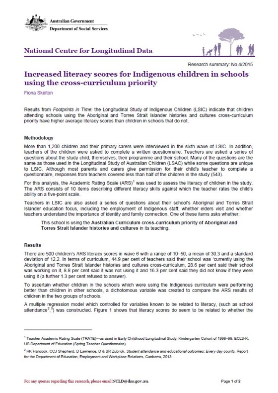 Results from Footprints in Time: the Longitudinal Study of Indigenous Children (LSIC) indicate that children attending schools using the Aboriginal and Torres Strait Islander histories and cultures cross-curriculum priority have higher average literacy scores than children in schools that do not.