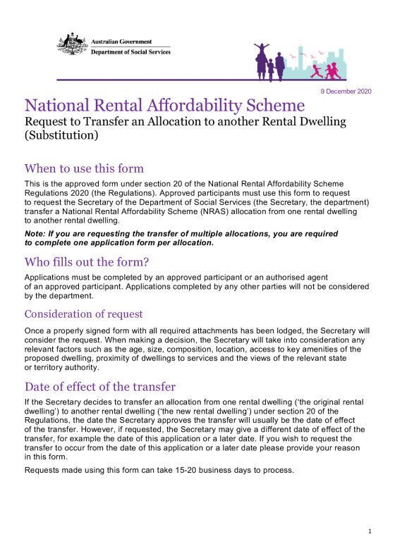 This is the approved form under section 20 of the NRAS Regulations. You must use this form to make an application to transfer an allocation to another rental dwelling.