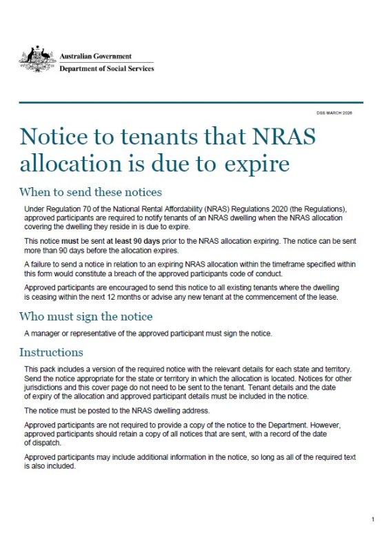 Under section 70 of the National Rental Affordability Scheme Regulations 2020, approved participants must provide the tenants of NRAS rental dwellings with written notice that the allocation for their rental dwelling is coming to the end of its incentive period.