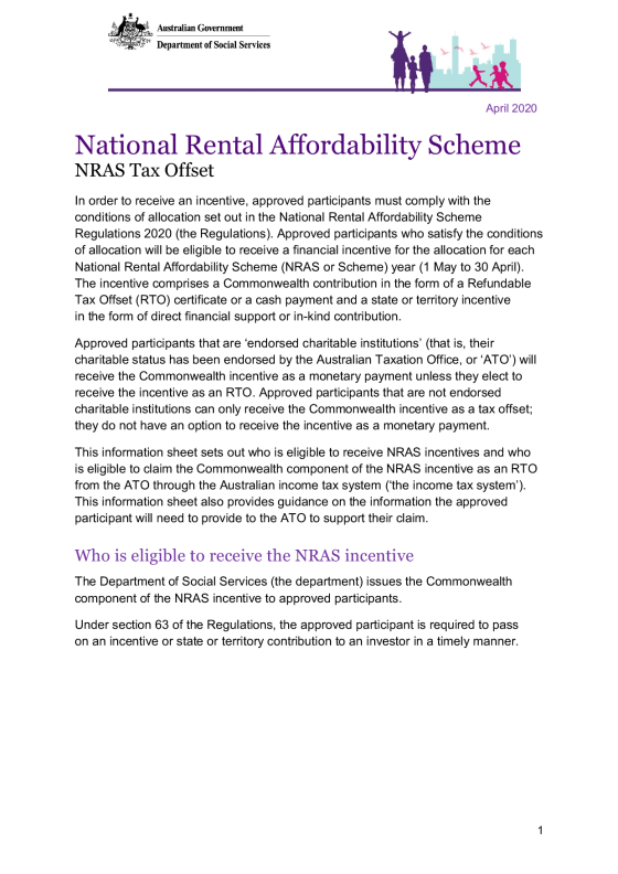 This information sheet sets out who is eligible to receive the NRAS incentive and who is eligible to claim the Commonwealth component of the NRAS incentive as an RTO from the Australian Taxation Office (ATO) through the income tax system. It also provides guidance on the information the eligible person or entity will need to provide to the ATO to support their claim.