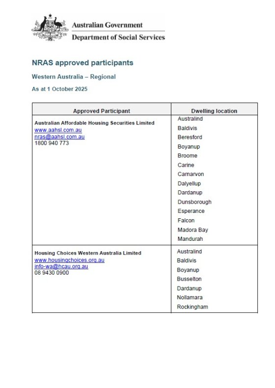 For your convenience, we have attached a list of contacts that manage NRAS dwellings, across Western Australia regional and city area.