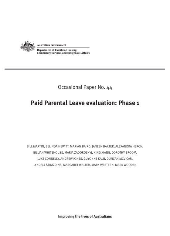 An independent evaluation of the Paid Parental Leave scheme was completed over four phases between 2010 and 2014. The evaluation was conducted by a consortium of experts led by the University of Queensland’s Institute for Social Science Research. It is based on data collected through interviews and surveys with parents and employers.