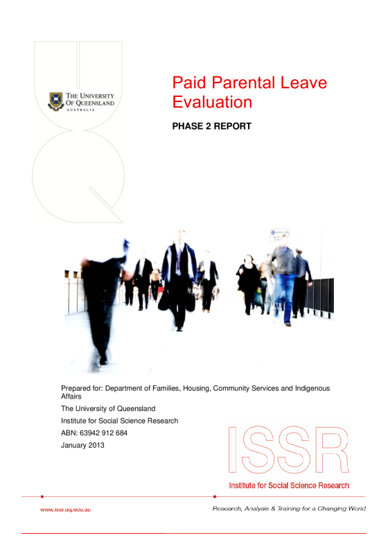 An independent evaluation of the Paid Parental Leave scheme was completed over four phases between 2010 and 2014. The evaluation was conducted by a consortium of experts led by the University of Queensland’s Institute for Social Science Research. It is based on data collected through interviews and surveys with parents and employers.