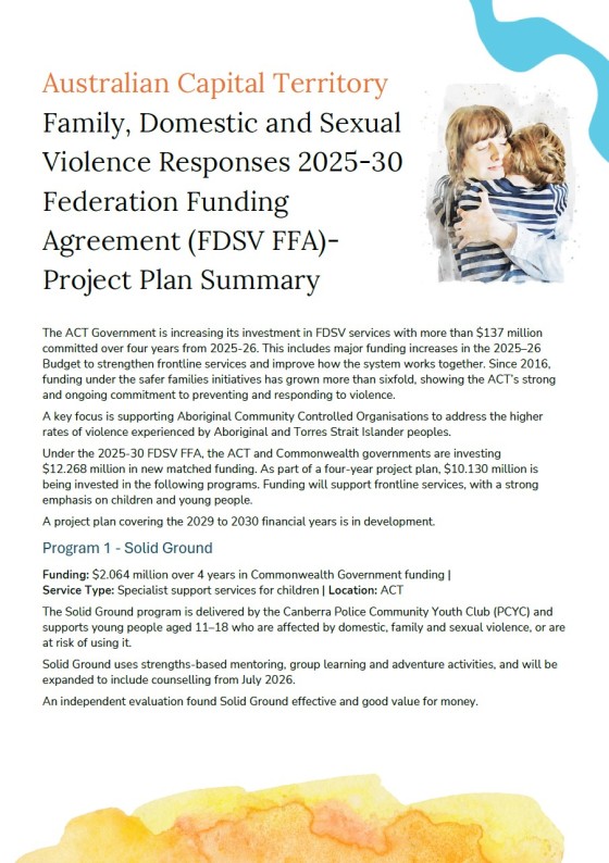 The Australian Capital Territory 2025–30 FDSV FFA Project Plan Summary for 2025–26 will be updated each year over the next five years (2025–2030).