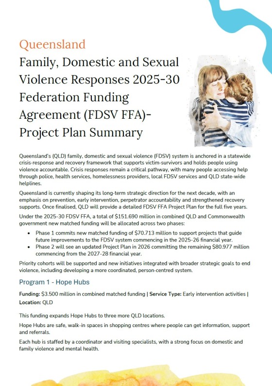 The Queensland 2025–30 FDSV FFA Project Plan Summary for 2025–26 will be updated each year over the next five years (2025–2030).