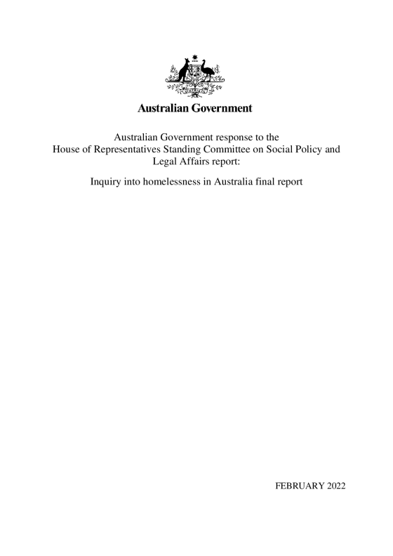 The Australian Government welcomes the Final Report of the Inquiry into homelessness in Australia, and thanks the House of Representatives Standing Committee on Social Policy and Legal Affairs for its work. The Government also acknowledges the Interim Report, Shelter in the storm – COVID-19 and homelessness.